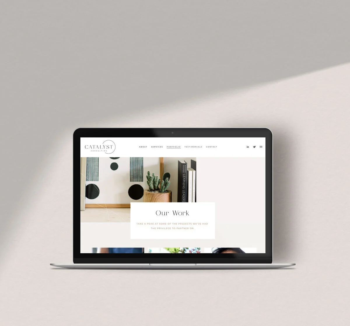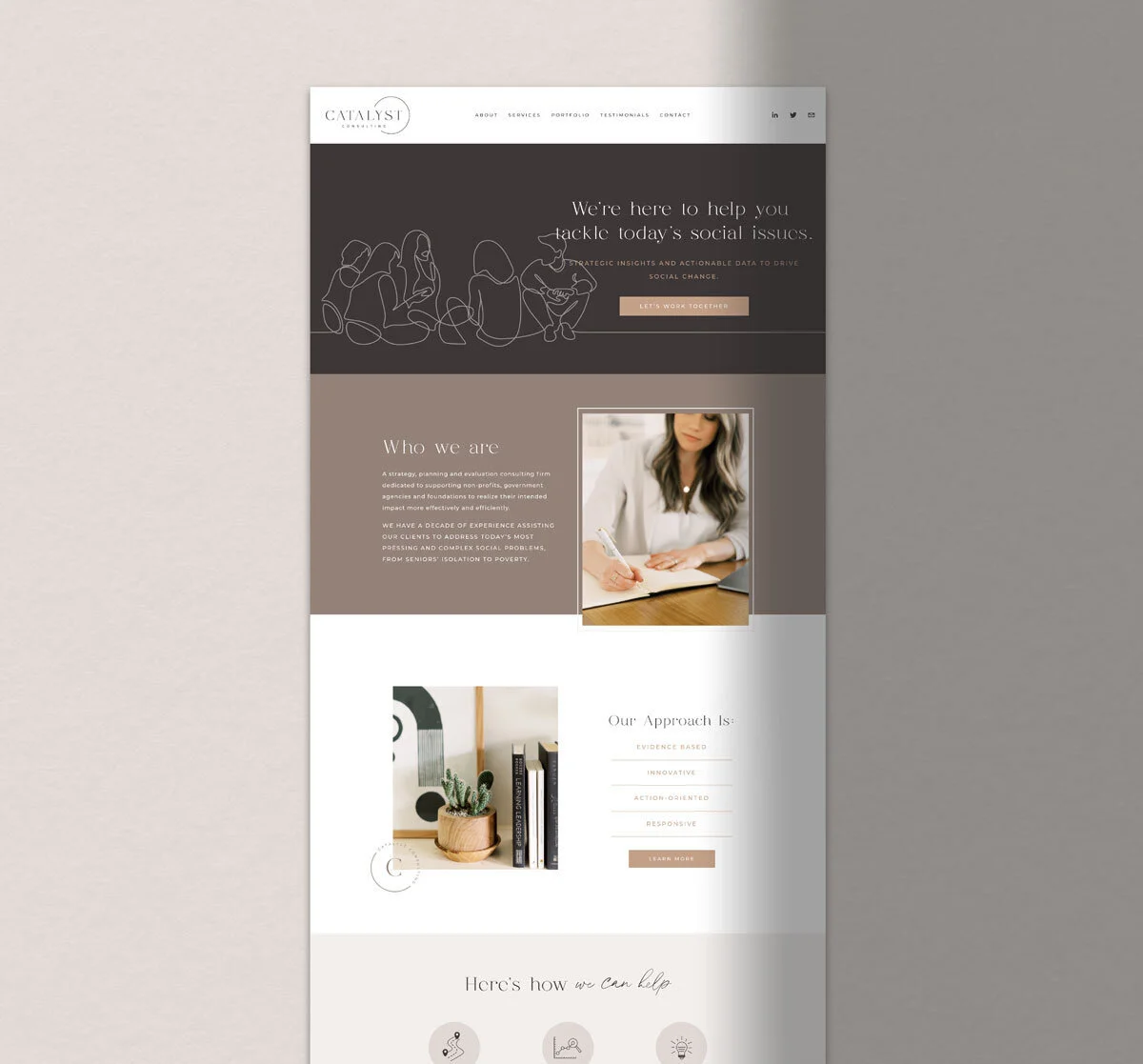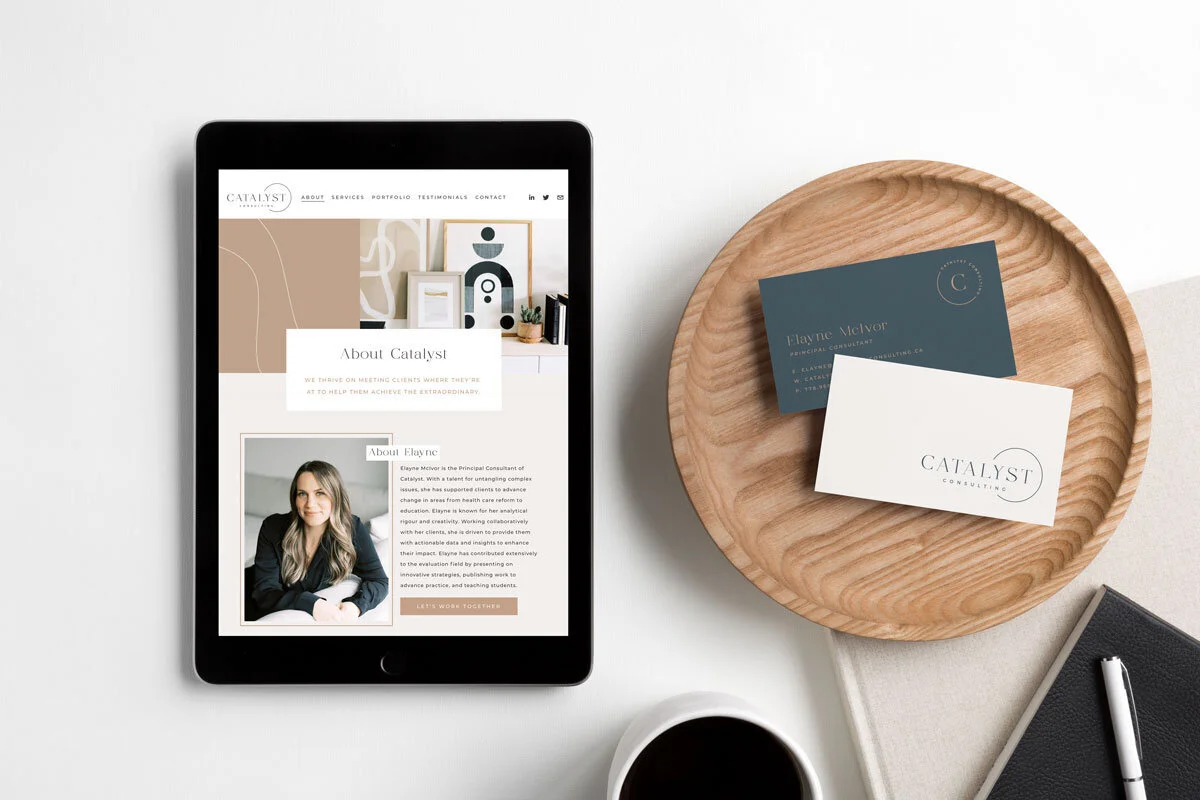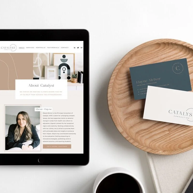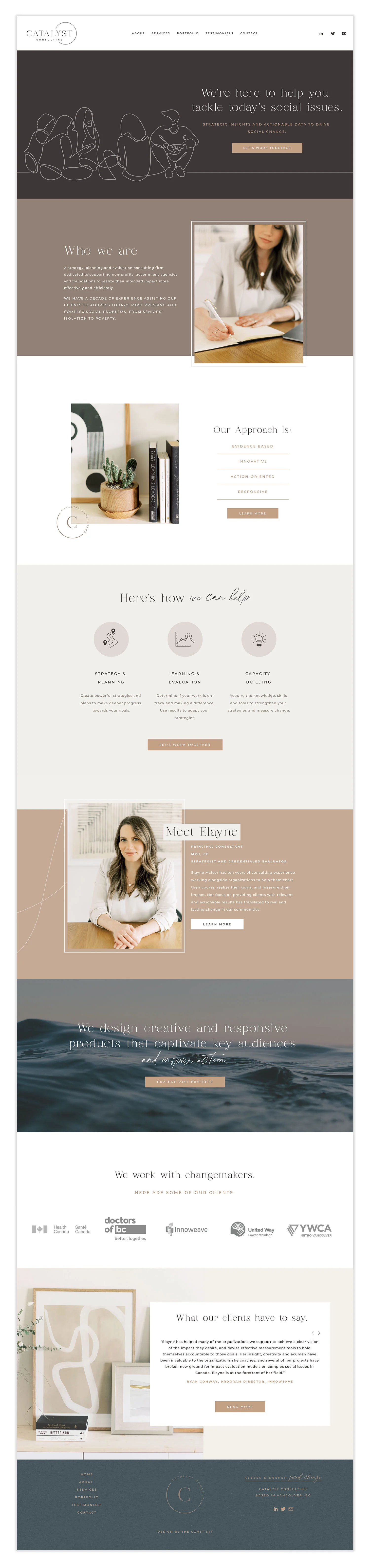 Through our All Inclusive Package, we first began her brand design keeping a clean & professional look, with warm and inviting elements. We also wanted her online space to look just as good, so we then custom designed a dynamic website for Elayne that showcases the impact Catalyst Consulting has on their community as well as the projects they are proud to be apart of.