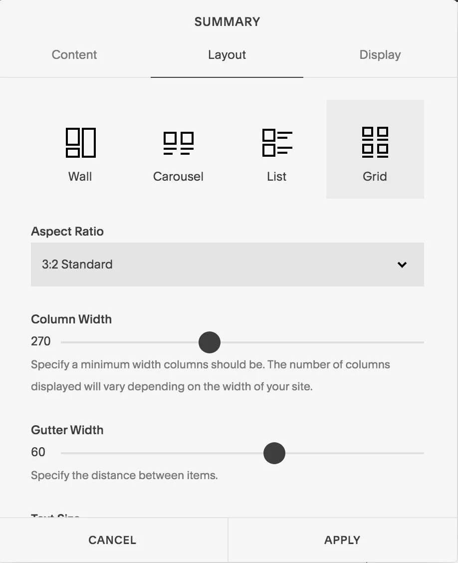 While Squarespace creates a “generic” page for you that shows your posts as a grid, you can easily add a summary block throughout your website. This gives you not only flexibility on how to display your posts (grid, masonry, carousel), but you can also create your own blog page with additional sections (such as a call to action or organizing your blog by categories).