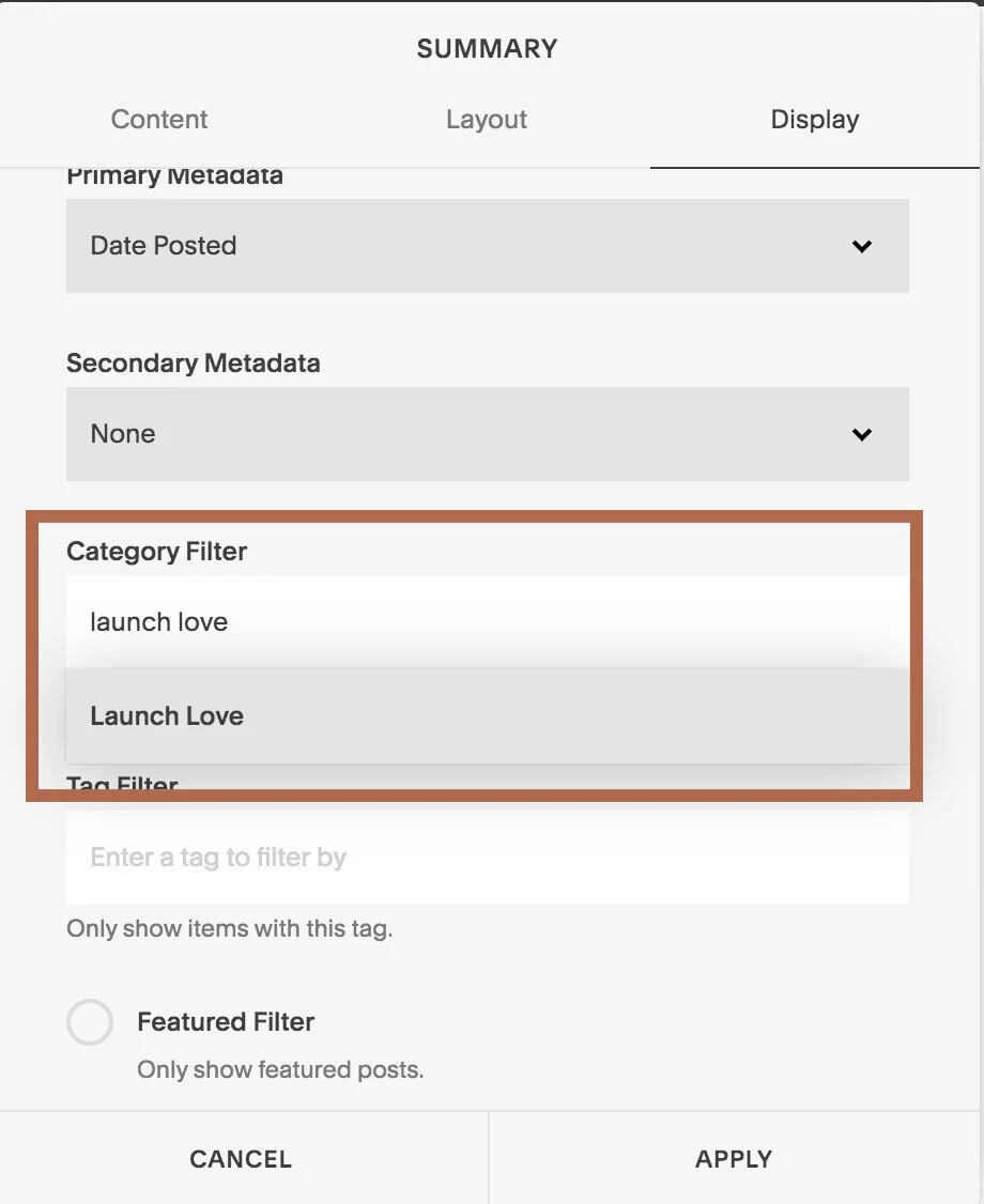 When adding in a summary block, it is very easy to filter out categories and tags. With that, it’s you can add a category dropdown and search bar as well on your blog page, making it even easier for your visitors to find what they’re looking for.