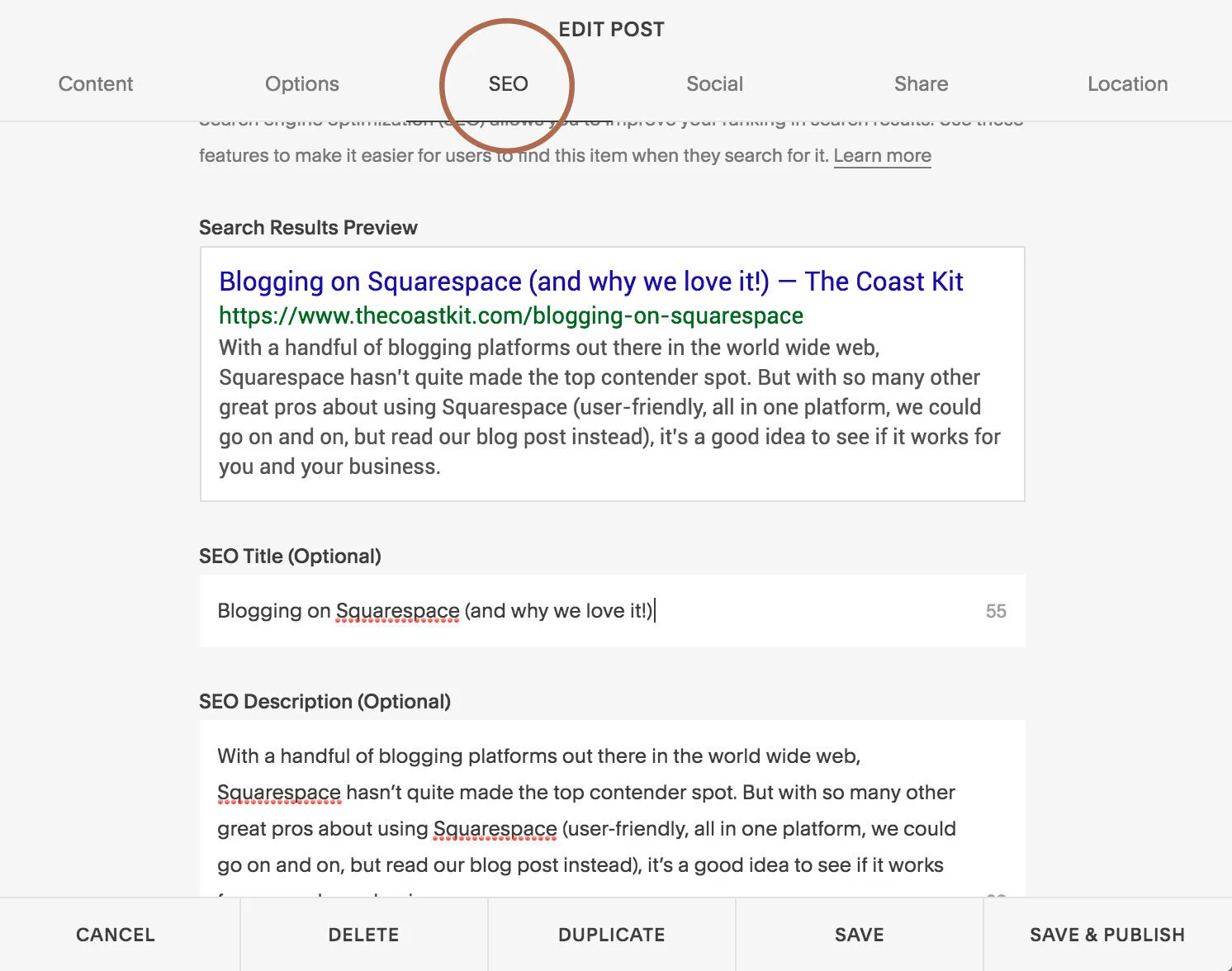 There are still so many great options for each individual blog post to add in keywords and descriptions so that your SEO doesn’t get left behind. Even better, you can set a specific location for posts (if you’re a location based business) and social sharing that can automatically push your content (for Pinterest and Facebook!).
