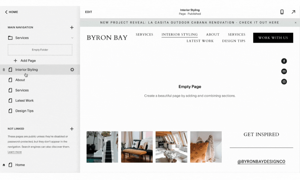 When designing a website, we highly recommending keeping it simple and concise, whether it’s your content or amount of pages found in your navigation. You’ll notice most of our website templates have a HOME plus five inner pages and when you start adding more to your navigation, it begins to feel overwhelming. Luckily, Squarespace allows us to add in dropdown menus for you to organize your pages, whether you want to breakdown more of your services, galleries, or even shop or blog categories!