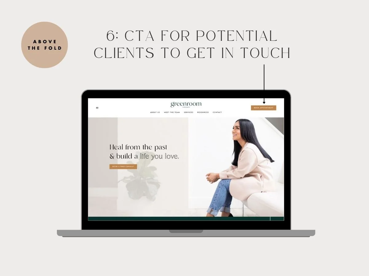 Your website should ultimately have one primary ACTION you want your clients to take. Whether that’s filling out your Contact form for project inquiries, Booking an Appointment with you or buying from your online store, having a strong CTA in the section above the fold can help direct clients where you’d like them to go instantly as it’s a central location on your website that clients don’t need to go looking for.