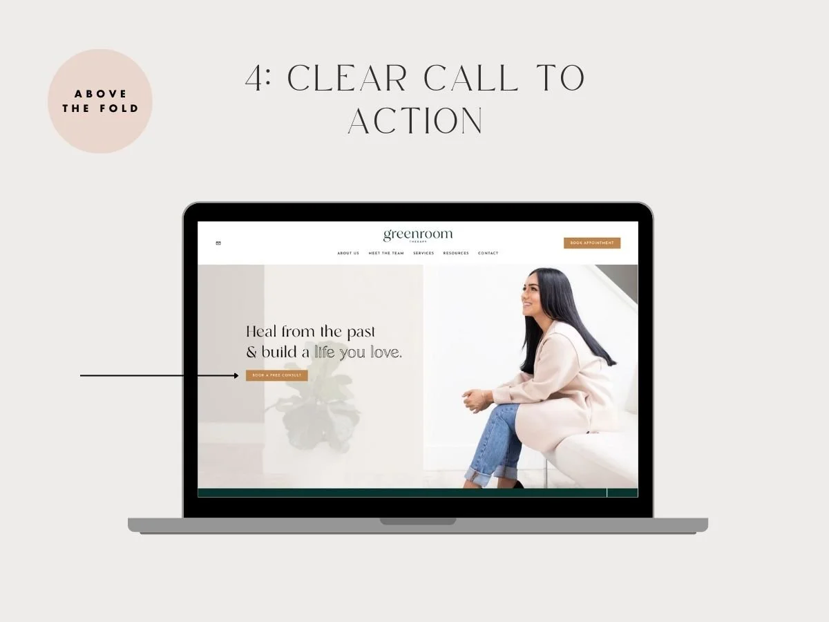 A clear Call To Action above the fold is always a great way to guide your visitors where you want them to go. A call to action should be simple and actionable. It should include a verb (action word) that clearly directs the visitor on what they should do next such as REGISTER NOW / LEARN MORE / BOOK A FREE CONSULT (and so on!).