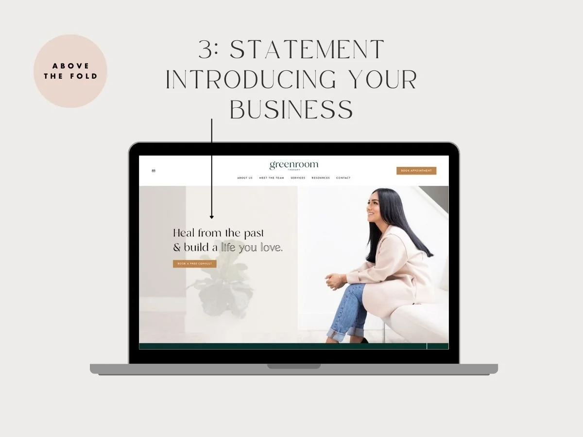 The intro statement on your website is another one of the most important elements to have above the fold on your website. Simply put, this is your mission statement defining who you are and what you stand for and why people should care about you and your business! Within seconds, potential clients need to know what you do, and if they have to scroll on further to figure this out, this may ultimately impact your bounce rate, leaving clients super confused!
