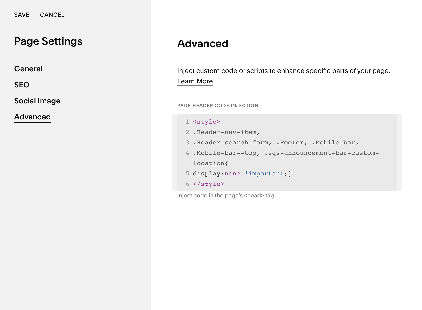 TIP: IF YOU WOULD LIKE TO ONLY HIDE THE HEADER AND FOOTER ON ONE SINGLE PAGE, ADD THE FOLLOWING CODE IN THE SETTINGS OF THAT PAGE (INDEX PAGE FOR 7.0) AND PLACE UNDER ADVANCED.