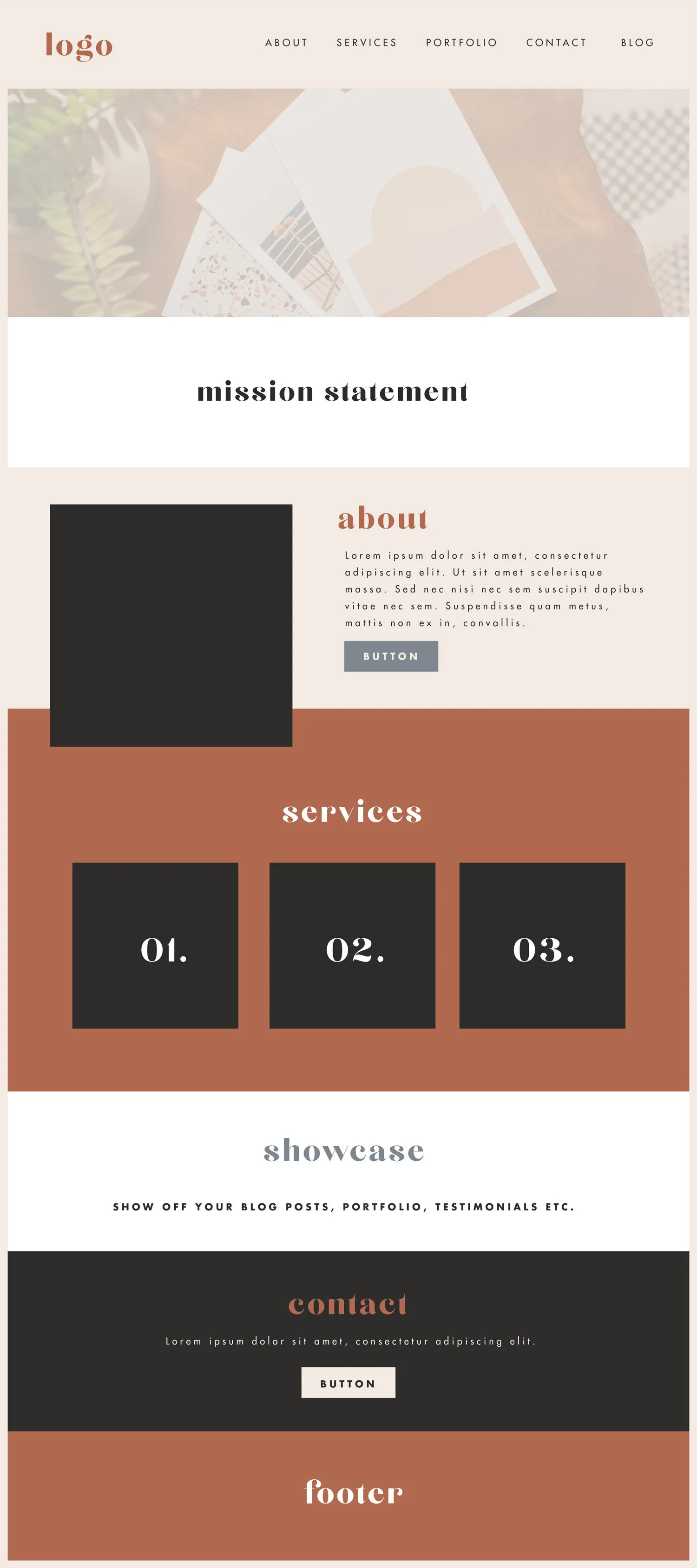 Our favourite examples? Your ABOUT section can simply have a paragraph with a button (call to action) that leads to the ABOUT page with more of your bio/information. Before your visitor gets there, they’ve already learned a thing or two. Your SERVICES section can simply have just the service title listed on the homepage as a grid, and if your client would like more info, they can click through.