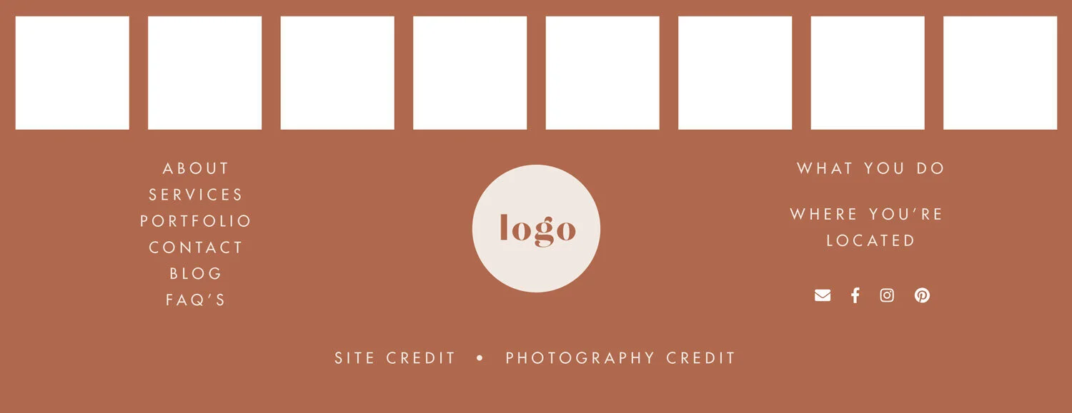 We recommend adding in your site navigation again below (and as mentioned above, if you have some extra pages). You’ll likely want to add in a blurb about what you do and location (if it’s important) as this helps with search engine optimization. To keep brand consistency, we love to add a little branding element (maybe your logo or an icon).