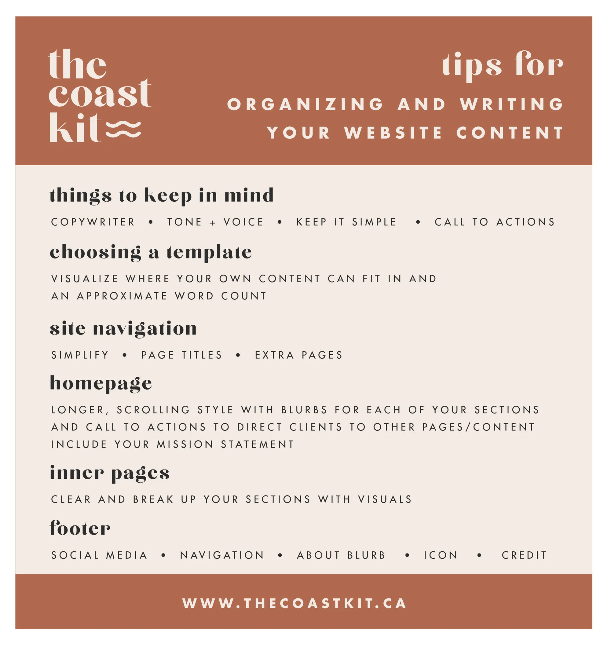 Each of your inner pages will be unique to you, but feel free to use our template kits as inspiration for your content. Our biggest takeaways after years of designing websites is to keep it clear and break up your sections with visuals (images, banners) and use columns instead of long sentences. And of course, don’t forget those CALL TO ACTIONS and keeping your IDEAL CLIENT in mind.